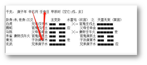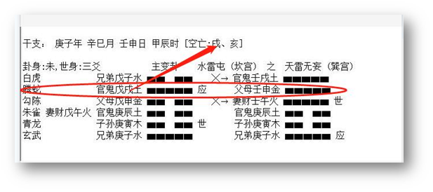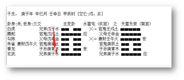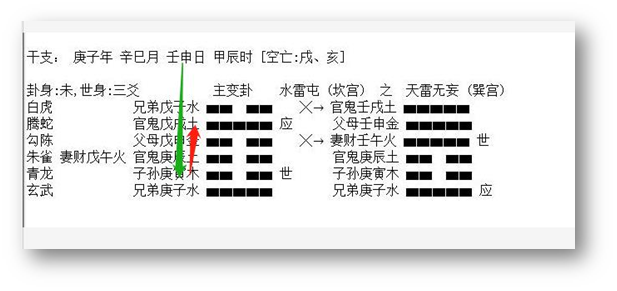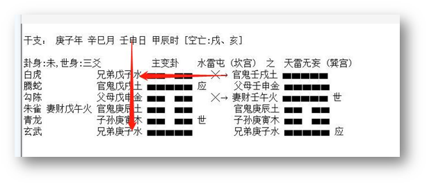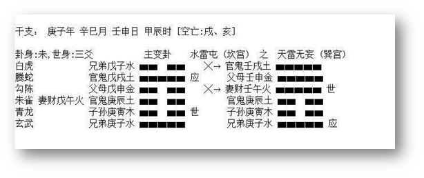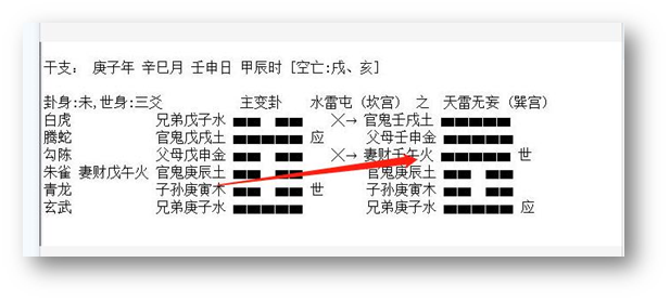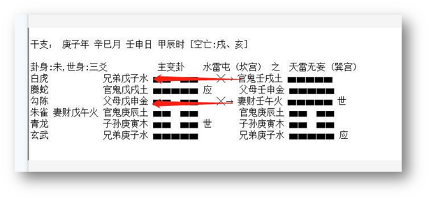 2、 应爻是对方,临鬼是心里有鬼,是有毛病的一方。临蛇是心神不安。应爻临空,应爻的财是子水,又动化回头克。克的还是应爻,说明,对方不想给钱,就在那硬挺了。这里,克者为财,所以断应爻克的子水是他的财。在五爻是路上,临蛇,我们想象一下,骑车、开车不走直线,伤了人。