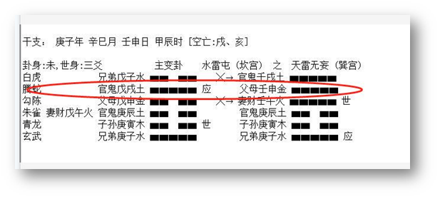 我们先看申,归到父四爻上,已知她去处理姑母被撞的事。申又冲世。这里,是为姑母的事感觉到身心惫,费脑子,不知道怎么办。另一个参与的爻是巳火,是财爻,合申。这应该就是赔钱的事,在反复想如何处理?